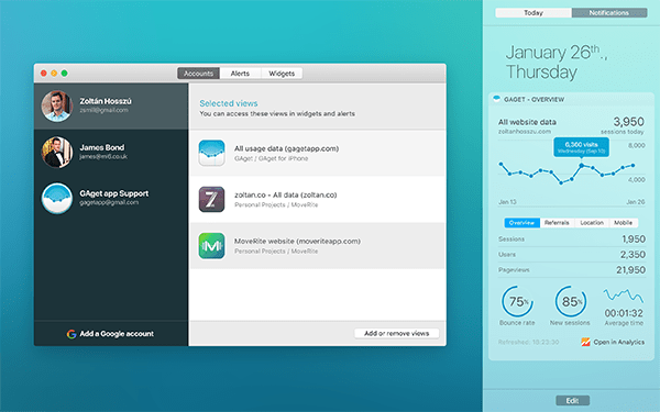 Logging into your Google Analytics dashboard to check your latest visitor counts can be time consuming, so app developer Zoltán Hosszú built GAget 2: an beautiful Google Analytics widget that lives in your macOS Notification Centre.