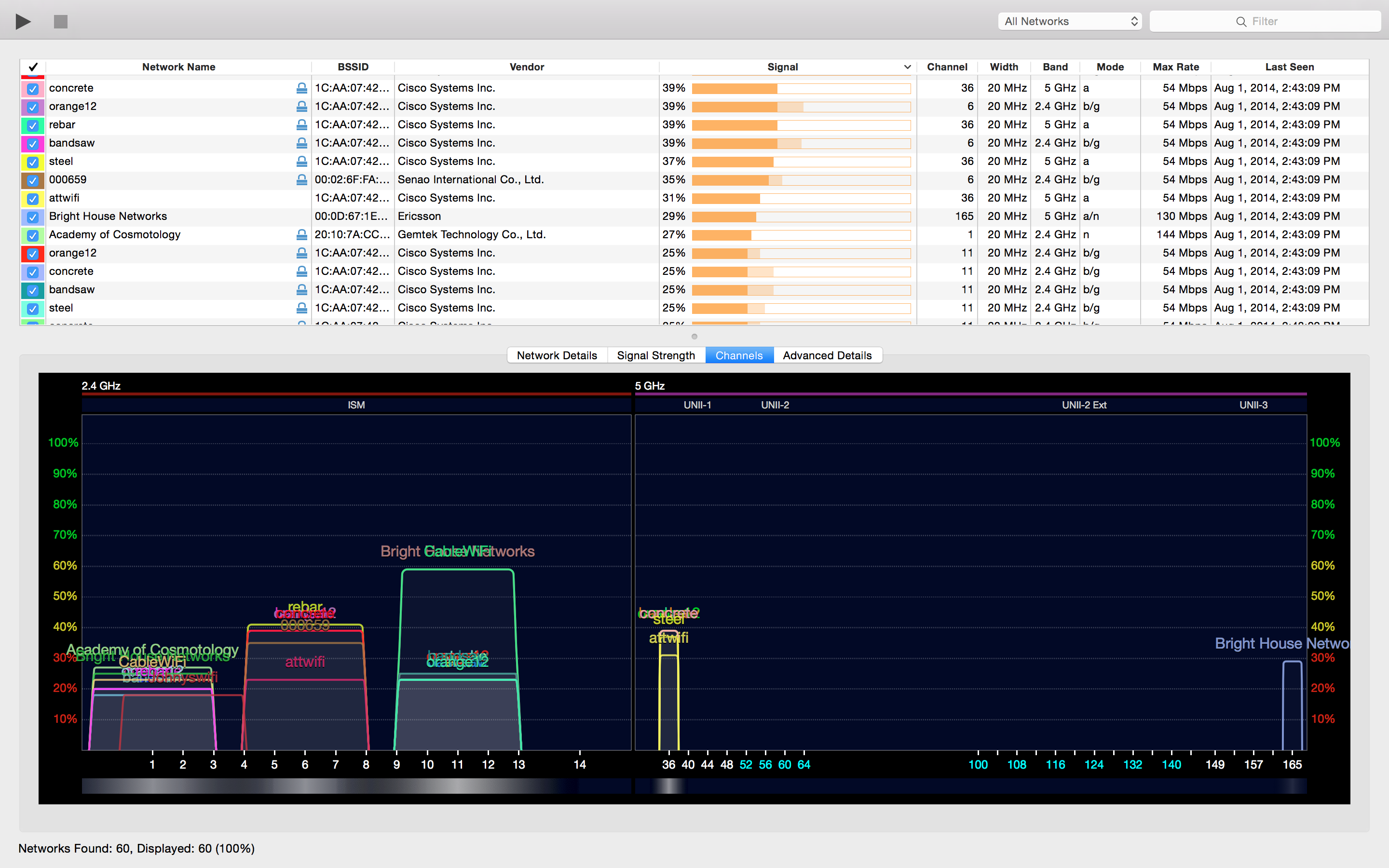 Information includes network name (SSID), BSSID (which is the hardware MAC address of the device), vendor, channel, band, security configuration, supported data rates, and much more. It supports 802.11b/g/n networks in the 2.4 GHz frequency band, as well as 802.11a/n/ac in the 5 GHz frequency band.